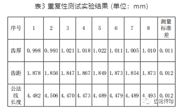 使用本系統對待測件上同一齒進行8次測量,再對數據進行比較,可得到測量重復性的分析結果,待測件測量參數如表3所示。