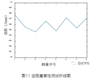 由表3測量結果,運用貝塞爾公式進行重復性標準差的計算,可以得出三項齒輪參數測量結果的重復性標準差均小于等于0.013mm,以齒距的重復性測試為例,作出圖 11所示折線圖,可以清晰的判斷出該測試齒序的齒距在 1.847mm~1.878mm之間,可見本系統的測量重復性較高。