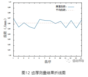 從表4中反映的是對齒輪14個齒序的齒厚、齒距以及分別14個齒序為基準的三齒公法線長度,以齒輪齒厚為例,作出如圖12所示的折線圖,比較直觀的展示出齒輪的齒厚情況,可以看出,齒輪齒厚、齒距、公法線長度與齒輪規格參數偏差最大僅有0.002mm,可見本系統的測量重復性精度極高,測量所得結果具有很高的正確性。