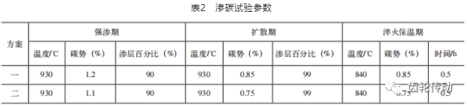 18CrNiMo7-6鋼中富含碳化物形成元素Cr,在碳勢較高的情況下,表面容易形成角狀或網狀碳化物,嚴重縮短零件的使用壽命,20CrNi2MoA鋼中富含非碳化物形成元素Ni,表面不容易形成網狀碳化物,考慮3種材料在滲碳過程中吸碳能力不同,試驗中共設計了兩種方案,具體試驗參數見表2,工藝中設定滲層深度為1.7mm,心部碳含量(質量分數)設定為0.4%。