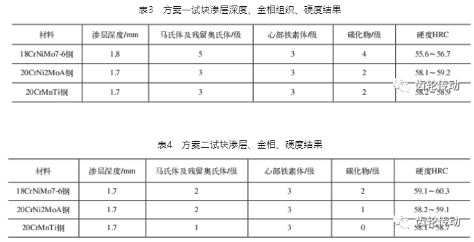(1)滲層深度、金相組織、硬度結果采用方案一滲碳處理后,3種材料試塊滲層深度、金相組織、硬度結果見表3。采用方案二滲碳處理后,3種材料試塊滲層深度、金相組織、硬度結果見表4。