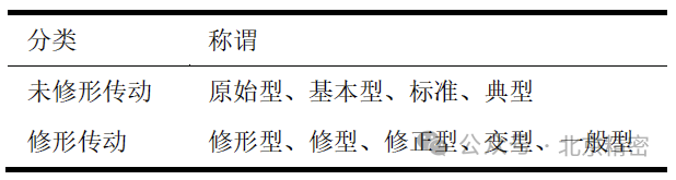 除了對參數(shù)進行優(yōu)化外,實踐表明合理的修形也可以提高平面二次包絡(luò)環(huán)面蝸桿傳動的性能。對于平面二次包絡(luò)環(huán)面蝸桿傳動,修形分為兩種:一種是基于嚙合原理的修形,通過第一次包絡(luò)的部分相對運動參數(shù)不等于第二次包絡(luò)的相對運動參數(shù)來實現(xiàn)。這些參數(shù)可以是中心距、傳動比、蝸桿與蝸輪的相對軸向位置等。這種修形方式需要對蝸桿和滾刀進行同樣的修形,修形后的平面二次包絡(luò)環(huán)面蝸桿傳動仍是線接觸. 另一種是失配修形,主要采取第一次包絡(luò)過程中包絡(luò)蝸桿和包絡(luò)滾刀的參數(shù)不一致或采用其他類型的環(huán)面蝸桿來代替平面包絡(luò)環(huán)面蝸桿等方式。修形后的齒面不再是線接觸。對于這兩種修形方式,很多文獻并沒有區(qū)分開來,并且對于修形和未修形的平面二次包絡(luò)環(huán)面蝸桿傳動存在多種稱謂,如表1所示。