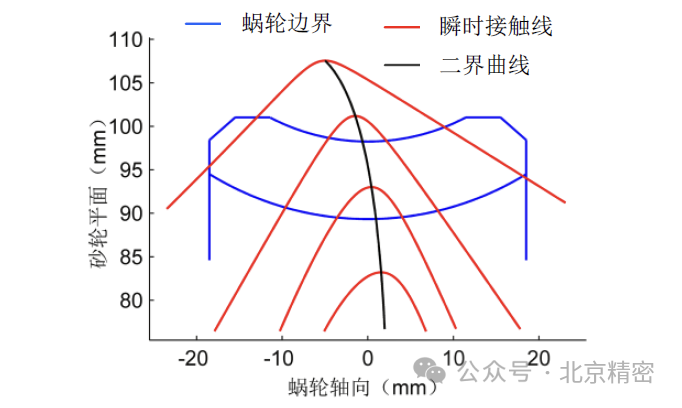 在20世紀90年代以前,評價平面二次包絡(luò)環(huán)面蝸桿傳動宏觀接觸狀態(tài)的瞬時接觸線、齒面接觸區(qū)域、各類界限曲線和評價微觀嚙合性能的誘導(dǎo)法曲率半徑系數(shù)、相對卷吸速度、潤滑角的計算都已經(jīng)非常成熟。以中心距為125mm,傳動比為40的未修形平面二次包絡(luò)環(huán)面蝸桿傳動為例,平面二次包絡(luò)蝸輪齒面上瞬時接觸線的分布如圖1所示。齒面存在接觸線交叉區(qū),該區(qū)域接觸頻率較高,容易發(fā)生疲勞點蝕,是蝸輪齒面最薄弱的地方。