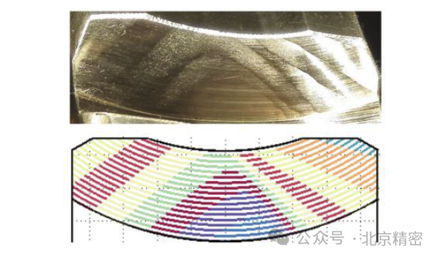 加工大型、單件或小批量的平面二次包絡(luò)蝸輪時滾刀的制造成本比較高,故適合對蝸輪進行數(shù)控銑削加工。數(shù)控銑削技術(shù)的基本思路是建立平面二次包絡(luò)蝸輪的模型之后,依據(jù)模型對加工路徑進行規(guī)劃,然后在數(shù)控機床上使用普通刀具對毛坯進行數(shù)控切削。作者在配備第四軸的立式加工中心上對II型傳動蝸輪進行了銑削加工。滾切和銑削后的蝸輪對比如圖9所示,左側(cè)為滾切得到的蝸輪。通過比可以發(fā)現(xiàn),銑削的蝸輪齒面不再存在切削棱,而且可以定量切除一界曲線及其附近區(qū)域。銑削的蝸輪跑合半小時內(nèi)傳動性能即可達到設(shè)計要求。