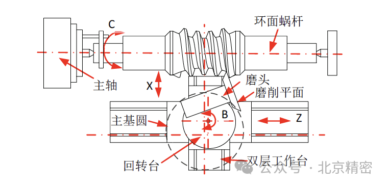 虛擬回轉(zhuǎn)中心技術(shù)主要用于平面包絡(luò)環(huán)面蝸桿齒面的磨削。采用該技術(shù)的機床床身結(jié)構(gòu)為車床樣式或外圓磨床樣式。以車床樣式為例,開齒后的環(huán)面蝸桿安裝在主軸上,雙層工作臺上安裝了回轉(zhuǎn)臺,回轉(zhuǎn)臺上又安裝有磨頭。雙層工作臺沿X向和Z向進行圓插補運動,帶動回轉(zhuǎn)臺做平移,與此同時回轉(zhuǎn)臺沿B軸做旋轉(zhuǎn)運動,蝸桿繞C軸也轉(zhuǎn)動相應(yīng)的角度進行四軸聯(lián)動。四聯(lián)動軸的運動關(guān)系為圓插補運動轉(zhuǎn)動的角度等于回轉(zhuǎn)臺轉(zhuǎn)動的角度,蝸桿轉(zhuǎn)動的角度與回轉(zhuǎn)臺轉(zhuǎn)動角度的比值為傳動比。此外磨削過程中通過控制插補運動的半徑,來保證砂輪磨削平面始終與虛擬的主基圓相切,砂輪回轉(zhuǎn)邊緣始終與蝸桿齒根相切。這樣就實現(xiàn)了平面包絡(luò)環(huán)面蝸桿齒面的磨削。采用虛擬回轉(zhuǎn)中心技術(shù)的機床取消了中心距調(diào)整機構(gòu)和主基圓半徑調(diào)整機構(gòu),而且與傳統(tǒng)的加工方式相比其回轉(zhuǎn)臺尺寸縮小了很多,增大了機床的加工范圍,機床操作也簡單。但是聯(lián)動軸數(shù)多,對機床的精度要求高。