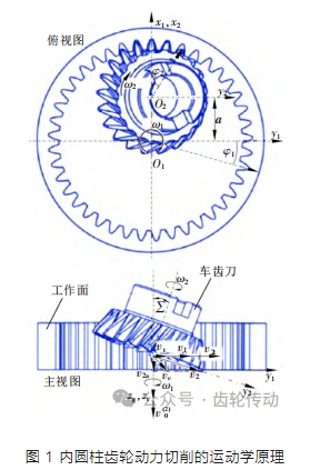 刮齒是通用齒輪制造中的一種連續切削方法。在這種制造技術中,它與一般的車刀和刮刀不同。切削過程是由刀具與工件之間的相對速度引起的。刀具相對于工件放置在橫軸角度上,類似于剃須過程,并且刮齒動作是由刀具和工件之間的相對速度引起的。相對于內齒輪的刮削刀具的幾何結構如圖 1 所示。將笛卡爾坐標系 S1(O1-x1y1z1)和 S2(O2-x2y2z2)分別假設為工件和刮齒刀的運動坐標系,且工件與刮齒刀之間為剛性連接。在圖 1 主視圖中可以得出,內齒輪在 S1 坐標系中進行定位,其旋轉軸與 z1 共線。而刮齒刀則在 S2 坐標系中進行定位,其旋轉軸與 z2 共線。刀具中心通過矢量距離 a 定位在 xy 平面中心,齒輪和刀具的節距圓在圓周的最低點進行切向接觸。同樣,在圖 1 俯視圖中對工件軸和刮齒刀軸構成的刀具工作角度進行了示意。以直齒輪為例,軸向進給速度 v(2)0 與 z1 共線,假設工件運動角速度和刀具運動角速度分別為 ω1 和 ω2。隨著軸向進給 v(2)0開始,工件繞 z1 旋轉 φ1,刀具繞 z2 旋轉 φ2。在滾動刮齒過程中,利用工件和刮齒刀具相對運動使得切削速度 vc 形成定位約束。如圖 1 所示,刀具速度 v2 被劃分為軸向速度 v2a 和切向速度 v2t。然后,切向速度 v2t 和工件運動速度 v1 耦合得到切向速度 vt。因此,切削速度 vc 由軸向速度 v2a 和切向速度 vt 引起。在加工斜齒輪的情況下,行程運動中取 z1 軸方向作為進給方向,但增量角速度 Δω1 依賴于軸向進給,必須添加到 ω1。工件的增量角速度 Δω1為: