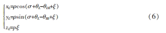 假設理論刮齒面上刮齒邊緣存在某一特定的點 m0 的極徑為 ρ0,進給極角為 θL0,ρ0 與刮齒刀坐標系 S2(O2-x2y2z2)中 x2 軸的夾角為 σ;刮齒邊緣其余任意一點 m1 的極徑為 ρ,進給極角為 θL,則∠(ρ,ρ0)=θL-θL0,且∠(ρ,x2)=σ+θL-θL0。隨著刮齒刀運動轉角為 ξ 時,刮齒刀自身相當于沿 z1 方向移動 pξ,因此,理論刮齒面參數方程描述為: