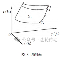 根據刮齒加工過程,若干次切削共同作用完成工件加工齒面。刮齒刀在每次切削進程中都會在 S1(O1- x1 y1 z1)下形成一個空間曲面∑1,如圖 3 所示。C1 表示 t1 時刻的切削刃,基于空間運動學原理,可得刀刃切削面方程: