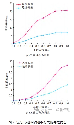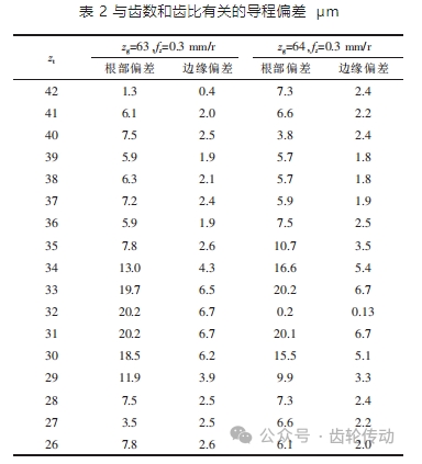 當工件齒數為偶數時,如圖 6b 所示,刮齒刀齒數為 31 和 33 時,導程偏差達到了 20.2 μm。由于工件和刮齒刀的齒比決定了齒側的導程偏差。因此選擇合適的刮齒刀齒數有利于提高刮齒加工精度。此外,若工件齒側質量要求較高,刮齒刀齒數應該利用最大公約數來選擇。但是需要避免使用半齒數的刮齒刀具,除非工件齒數為偶數,齒比恰好為 1/2。