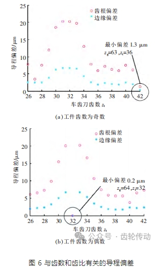 此外,如果刮齒刀齒數約為工件齒數的一半,除去齒數均勻,齒比恰好為 1/2 的情況,導程偏差大于其他情況。當工件齒數為奇數時,如圖 6a 所示,刮齒刀齒數 為 30,31,32,33 時,導程偏差最大,達到了 20.2 μm。