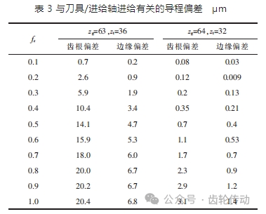 適當減少每個齒輪的軸向進給可以進一步減少進給誤差的深度。與刮齒刀軸向進給相關的導程偏差如表 3 和圖 7 所示。隨著軸向進給量的增加,導程偏差會逐步增大。例如當 fz=0.5 mm/r,zg=63,zt=36 時,工件齒輪導程偏差為 0.7 μm。然而當 fz=0.5 mm/r,zg=64,zt=32 時,工件齒輪導程偏差為 0.7 μm。因此,齒側進給量偏差與齒比有關。對于具有最大公約數的工件和刮齒刀的齒數,為了提高加工效率,需要提高軸向進給量。如果工件齒數與刮齒刀齒數不匹配,則必須選擇軸向進給,直至導程偏差滿足加工要求。然而,如果軸向進給量過小,導致刮齒刀運動與切削方向相反,則會增加刮齒循環時間。