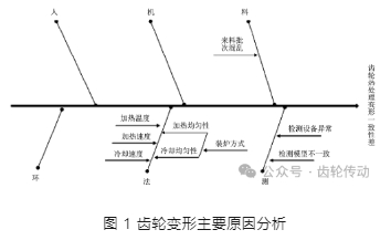 同爐工件在爐內(nèi)不同位置的熱變化、冷處理過(guò)程均勻性影響因素既受設(shè)備影響,如設(shè)備內(nèi)加熱管排布位置、循環(huán)空氣走向、攪拌速度等;也受零件裝料方式影響,特別是零件從滲碳轉(zhuǎn)入淬火冷卻過(guò)程中,因時(shí)間差導(dǎo)致各零件散熱不一致,冷卻速度相差甚遠(yuǎn)。在實(shí)際生產(chǎn)中,確定裝料方式相對(duì)于控制毛坯材料間化學(xué)成分、金相組織等更有效、更直接。因此,本文基于實(shí)際生產(chǎn),主要開(kāi)展不同裝料方式對(duì)齒輪熱處理變形一致性、穩(wěn)定性試驗(yàn)探索,齒輪變形主要原因分析如圖 1 所示。