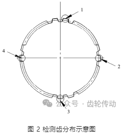 1)齒輪鍛造、銑削等工序結(jié)束后,每輪試驗(yàn)隨機(jī)選取 15 套齒輪,并進(jìn)行刻字編號(hào),檢查熱前精度和齒形等。每個(gè)試樣檢測(cè) 4 個(gè)齒,檢測(cè)齒分布如圖 2 所示。