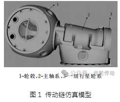 本文使用精益?zhèn)鲃佑嬎丬浖阅硻C(jī)型為研究對象,建立了輪轂、主軸系(包含主軸、軸承座、主軸承、支架)以及第一級行星輪系的一體化傳動鏈仿真模型,如圖1所示。在輪轂中心施加六自由度載荷,軸承座與第一級齒圈連接,主軸與第一級行星架連接,第一級行星輪系為 NGW 形式的直齒傳動。
