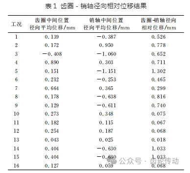 為了定位第一級行星輪系齒輪嚙合最差的狀態(tài),輪轂中心施加六自由度載荷進(jìn)行仿真分析。在輪轂中心載荷的作用下,主軸變形帶動第一級行星架、行星銷軸變形,軸承座帶動第一級齒圈變形,齒輪嚙合引起第一級齒圈、行星輪銷軸變形,綜合因素影響下得到第一級齒圈與行星銷軸的徑向相對變形量,如表1所示。