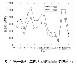 計算得到了齒輪嚙合齒面接觸應(yīng)力,如圖2所示。