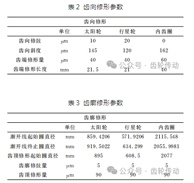 根據(jù)文獻(xiàn)介紹可知,根據(jù)經(jīng)驗公式計算得到的齒輪修形參數(shù),對齒輪傳動誤差和齒輪偏載情況會有所改善,但往往達(dá)不到最理想的效果。所以在經(jīng)驗公式的基礎(chǔ)上,通過精益?zhèn)鲃佑嬎丬浖M(jìn)行修形參數(shù)的尋優(yōu)迭代,最終得到的修形參數(shù)如表2和表3所示。