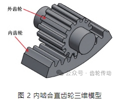 本文通過 KissSoft 齒輪專業(yè)設(shè)計軟件建立內(nèi)嚙合直齒輪的三維模型,并在 Inventor 三維軟件中對內(nèi)嚙合直齒輪三維模型進行了結(jié)構(gòu)設(shè)計。為降低有限元仿真計算量,此處截取了內(nèi)嚙合直齒輪一部分作為研究對象,具體結(jié)構(gòu)如圖 2 所示。通過調(diào)整外齒輪與內(nèi)齒輪的相對角度,使兩者的輪齒處于單齒嚙合區(qū)域,便于分析在單齒嚙合狀態(tài)下齒面接觸應(yīng)力分布情況。