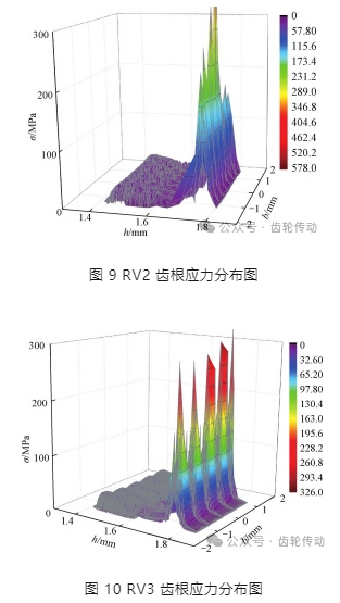從圖 9 至圖 12 中可以看出,相較于連續(xù)齒面的外齒輪齒根應(yīng)力分布云圖(見圖 4) ,齒根部分 (齒高 1. 4 mm 至 1. 6 mm 之間) 應(yīng)力分布呈波浪狀,波峰數(shù)或波谷數(shù)與齒寬方向的小齒牙數(shù)相同, 且隨著螺距的增加,外齒輪齒根部分波動幅度就越大。這是由于螺紋將齒輪分割成多個獨立的小齒牙,齒輪在嚙合過程中,有小齒牙的齒輪根部應(yīng)力值較大,形成波峰;在螺紋槽對應(yīng)的齒輪根部由于沒有小齒牙參與嚙合,齒根部分應(yīng)力值較小,形成波谷。隨著螺紋螺距的增加,螺紋的小徑減小, 即螺紋底徑更接近外齒輪的根部,齒輪在嚙合過程中,有小齒牙的根部需要分擔的抗彎拉力就增大,導(dǎo)致應(yīng)力值增大,螺紋槽對應(yīng)的齒根部分需要分擔的抗彎拉力減小,應(yīng)力值相應(yīng)減小,最終導(dǎo)致齒根部分應(yīng)力分布波動幅值增大。這種波動幅值增大現(xiàn)象將不利于齒輪的承載,在設(shè)計行星滾柱絲杠螺距時,在螺距較大的情況下需要校核齒根抗彎強度,防止小齒牙齒根斷裂失效。