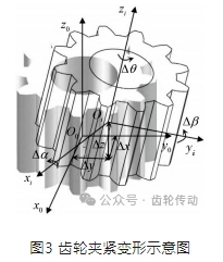 齒輪夾緊變形示意圖如圖3所示,若在齒輪初始安裝位置的中心上建立靜坐標系O0-x0y0z0,在齒輪夾緊變形后的位置中心上建立工件坐標系Oi -xi yi zi ,則可用齊次坐標變換矩陣表示齒輪位姿。