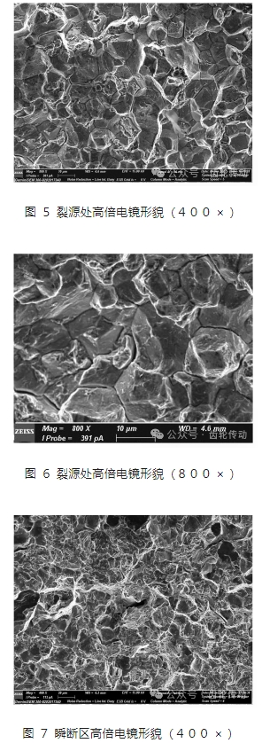 失效螺栓斷口宏觀形貌如圖 3 所示。圖中箭頭所示為裂紋快速擴展撕裂棱,并呈典型的棘輪狀特征分布。根據撕裂紋路收斂方向判斷裂源位于斷口邊緣表面區域,裂源處未見與斷裂有關的宏觀冶金缺陷和機械損傷痕跡,瞬斷區位于斷口中部。在宏觀體式顯微鏡下觀察,斷面粗糙,呈結晶顆粒狀,斷面干凈,無腐蝕產物,無明顯宏觀塑性變形,斷面呈典型的脆性斷裂特征,如圖 4 所示。