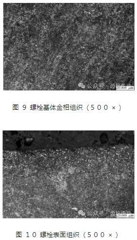 經拋光、侵蝕后進行金相檢查,如圖 9,基體組織為回火索氏體,奧氏體晶粒度約 8 級。值得注意的是,螺栓表面組織為回火索氏體+顆粒狀碳化物,表明存在增碳現象,如圖 10 所示。