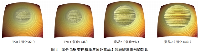 此外,在產品開發過程中,試驗也與國外同類長 壽命車輛齒輪油各項性能進行了對比。以 50 × 10 4 km 不換油的變速箱油 T50 和驅動橋油 A50 的抗磨性能考察來說,分別對油品進行老化試驗,不同的時間后,通過觀察其磨斑三維形貌圖的方式,開展了昆侖 50 × 10 4 km 不換油的驅動橋油 A50、變速箱油 T50 與國外競品的對比工作,結果如圖 3、圖 4 所示。