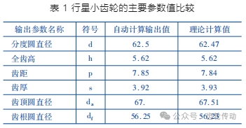行星小齒輪工程應用設計:已知行星小齒輪的設計模數 m = 2.5,齒數 z = 25,分別使用試驗系統和人工計算,對其系統自動計算輸出值與理論計算值進行對比分析,結果如表 1 所示,在誤差允許范圍內,系統輸出值與理論值高度一致。