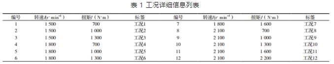 基于前文提出的智能運維 PHM 系統框架和關鍵技術,以某型號船舶發動機為例,進行系統和相關技術的初步驗證。目的是確認該系統在發動機工況識別、氣門間隙故障診斷以及健康狀態評估等方面的有效性。具體來說,本文將通過特征可視化方法,對發動機的工況識別進行驗證。其中,對潛艇、船用等發動機,保持長時間內轉速和負載的穩定不變是至關重要的。因此,工況(包括轉速和扭矩)成為運行狀態中常用且關鍵的性能參數,見表 1。