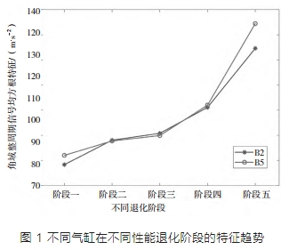 對發動機健康狀態評估的驗證,筆者在保證進氣門不變的情況下,調大了排氣門間隙,并選擇 B2 和 B5 氣缸進行退化特征對比分析。從圖 1 中可以看出,隨著氣門機構從一個階段退化到下一個階段,退化特征值呈現出明顯的差異,表現為遞增趨勢。這一結果有效地驗證了退化特征的有效性,見表 3。