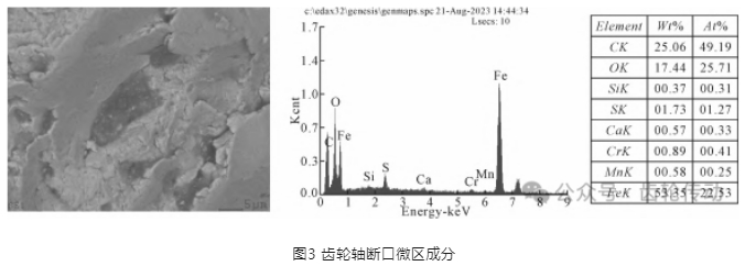 斷口觀察:由圖1觀察,斷裂位于齒輪軸與電機鏈接的R角位置,根據(jù)實際工況判斷該部位應力集中,整體斷口表現(xiàn)為類似花瓣狀開裂特征,每一齒分別開裂。對齒輪軸斷口進行超聲清洗后在掃描電鏡下觀察形貌,可觀察到斷口均由齒輪軸表面起裂,沿徑向向內(nèi)部擴展,斷口起裂附近斷面上存在明顯的疲勞弧線以及高溫氧化特征,氧化產(chǎn)物中存在含 S 等腐蝕性元素,形貌和成分見圖2、圖3。