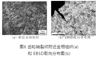金相組織和 EBSD 分析:斷口截面金相樣經(jīng) 3%硝酸酒精浸蝕后觀察金相組織,裂紋起源于齒底,起裂區(qū)及裂紋附近組織均為回火索氏體+少量貝氏體組織,材料進行過調(diào)質(zhì)處理,見圖6。EBSD 分析結(jié)果表明,裂紋起裂部位和擴展區(qū)域的晶粒取向無明顯的織構(gòu)特征,晶粒尺寸亦無明顯差異,試樣的有效晶粒尺寸為2.41μm,材料強度較高,見圖6。40Cr合金結(jié)構(gòu)鋼,一般經(jīng)過淬火及中溫回火后用于制造承受高負荷、沖擊及中等速度工作的零件,如齒輪、主軸等。該回火索氏體組織與材料的調(diào)質(zhì)處理工藝一致。