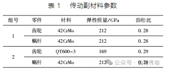 選用兩組材料配對來對比分析不同材料對傳動副接觸情況的影響,第 1 組齒輪和蝸桿均采用 42CrMo,氮化熱處理,第 2 組齒輪采用 QT600 - 3 , 蝸桿采用 42CrMo,氮化熱處理,各材料屬性如表 1 所示。