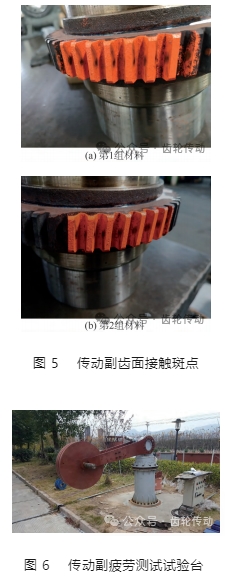 在齒輪嚙合儀上對傳動副進行對檢,其接觸斑點如圖 5 所示,接觸斑點分布與圖 3 有限元分析結果吻合。在浙江恒豐泰減速機制造有限公司搭建傳動副的疲勞測試試驗臺,按照要求評估超過 25 年設計壽命, 用來測試樣機的磨損情況和耐用性,如圖 6 所示。試驗分兩步,首先進行耐用性測試,按照超過 25 年的設計壽命要求,在齒輪試驗機上進行傳動副的負荷運轉試驗,考察齒面的磨損情況;然后進行疲勞破壞試驗, 在樣機自鎖情況下持續靜態加載直至斷齒,試驗機停止運行,考察輪齒折斷情況。