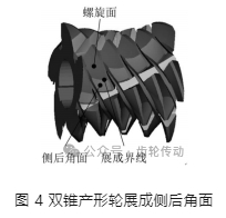圖 4 所示是未加工刀齒的后刀面時雙錐砂輪磨削出的側后角面,側后角面與基本環面蝸桿螺旋面相交成兩條線,靠近前刀面的部分為刃帶線,另一條為展成界線。從圖 4 可以看出,環面蝸輪滾刀各個刀齒側后角面的形狀各不相同。當環面蝸輪滾刀的刃帶寬和側后角角度給定后,雙錐砂輪磨削出的各個刀齒的側后角面和各個刀齒的展成界線是確定的。