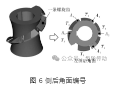 本文以某雙錐面二次包絡環面蝸輪滾刀為算例進行分析,其基本參數為: 中心距 a = 260 mm,頭數 z1 =5,傳動比 i = 8,包含五排刀齒。選擇左側后角面進行分析,對刀齒和左側后角面進行編號。用 Ai 代表左側后角面,Ti 代表刀齒號。