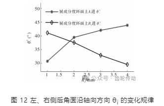 左、右側后角面在分度環面上的各個刀齒相應點的干涉角 θi 的變化規律圖 12 所示。可以得出,對于左側后角面,干涉角 θLi 逐漸增大,即對于左側后角面,從出口到入口,干涉角 θLi 逐漸增大; 對于右側后角面,干涉角 θRi 逐漸減小,即對于右側后角面,從入口到出口,干涉角 θRi 逐漸減小。即從入口到出口,左、右兩側的干涉角角 θi 逐漸減小,在入口處最大。
