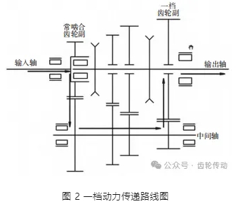 失效時變速器在進行疲勞耐久試驗,輸入轉速 1 600 rpm,輸入扭矩 1 000 N·m,失效齒輪為中間軸一檔齒輪,一檔時動力傳遞路線如圖 2 所示。