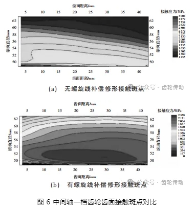增加螺旋線補償修形前后失效的中間軸一檔齒輪齒面接觸斑點如圖 6 所示,接觸斑點有明顯改善,最大接觸應力下降了 22%,極大地改善了齒輪的嚙合性能,能夠有效提高齒輪的壽命。
