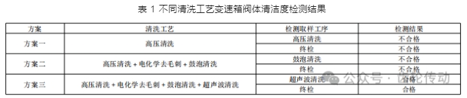 筆者公司通過對變速箱閥體不同清洗工藝進行試驗,選用同一壓鑄及機加工批次生產的變速箱閥體,在其它條件不變的情況下,驗證不同清洗工藝后變速箱閥體所能達到的清潔度。重點分析變速箱閥體清洗工藝對清潔度管控的影響,默認員工按照工序要求作業,且周轉容器及包裝容器清潔度符合要求,三種方案最終清潔度檢測取樣均在最后一道清洗工序及終檢之后,檢測結果見表 1。