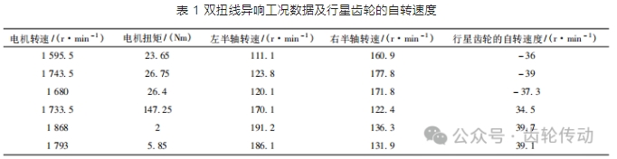 根據(jù)采集整車雙扭線異響工況測試數(shù)據(jù),通過式 (1) 計算出行星齒輪的自轉(zhuǎn)速度,如表 1.