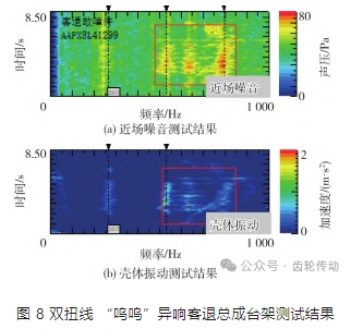 把客退有 “嗚嗚”異響的電驅(qū)動總成,按照整車異響工況上臺架進(jìn)行復(fù)測,發(fā)現(xiàn)近場噪音和差速器附件殼體振動明顯異常,進(jìn)一步鎖定異響來源為差速器總成內(nèi)部零件,故障復(fù)現(xiàn)測試結(jié)果如圖 8.