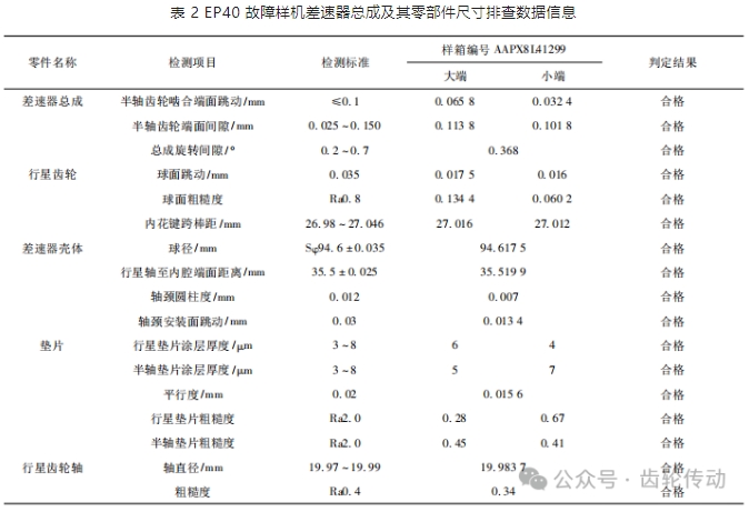 對故障件差速總成及零部件尺寸檢測,差速器總成相關(guān)間隙檢測合格如表 2,再進(jìn)行差速器總成拆解并進(jìn)行零部件尺寸檢測,尺寸合格如表 2,檢測結(jié)果可排除故障不是零件制造加工問題.