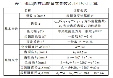 弧齒圓柱齒輪的設計過程可參考漸開線直齒圓柱齒輪進行,設計準則與直齒圓柱齒輪相同。在直齒圓柱齒輪設計過程中,因為齒輪的主要失效形式是齒面疲勞點蝕和輪齒疲勞折斷,所以根據齒輪傳動應用場合不同,可選用齒面接觸疲勞強度或齒根彎曲疲勞強度設計計算準則來進行設計計算。因此,在弧齒圓柱齒輪設計計算過程中,可參照漸開線直齒圓柱齒輪的設計計算過程,先選擇齒輪材料、熱處理方式及精度等級,然后根據使用工況來確定相應的設計準則,通過計算確定出小齒輪的齒數和模數。由于小齒輪齒數少,考慮到根切問題,小齒輪齒數在選擇時要滿足zmin≤ z1;一旦確定了小齒輪的齒數,大齒輪的齒數可根據齒輪傳動比來確定,即z2=iz1;然后,依據表1中幾何尺寸計算公式,計算出弧齒圓柱齒輪的主要尺寸;最后,再對弧齒圓柱齒輪強度進行校核即可。