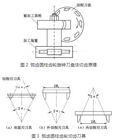 弧齒圓柱齒輪嚙合傳動性能較好,但由于切齒加工需要專用的加工設備與銑齒刀具,因此導致弧齒圓柱齒輪在機械傳動中不能大面積推廣應用。本文在研究弧齒圓柱齒輪設計計算基礎上,重點對弧齒圓柱齒輪的切齒加工進行了深入研究,提出了采用單面雙銑加工方法切制弧齒輪輪齒的凸、凹面,并基于專用的銑齒設備進行了銑齒加工。在弧齒圓柱齒輪的輪齒凸、凹面銑削過程中,刀具切入、退出時是沿著漸開線軌跡進刀,在調整機床完成第一個輪齒的凸面或凹面加工后,后續輪齒的銑削加工只需齒坯精確分度,然后再重復之前的切削進給即可。通過編制數控加工宏程序,在專用的銑齒設備上試切弧齒輪,切制出來的弧齒圓柱齒輪精度基本在6級~7級,經嚙合傳動檢驗證明切制的弧齒輪符合預期要求。此外,如果需要進一步提高弧齒輪精度,可采用磨齒機進一步對齒面進行磨削加工,以提高齒輪精度。