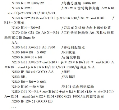 結合前述切齒工藝過程分析,可將弧齒圓柱齒輪切齒加工過程分三步進行:第一步,在弧齒圓柱齒輪齒槽中間下刀,采用三面刃齒槽銑刀銑出齒槽,切除大部分齒坯材料;第二步、第三步采用單面刃刀具分別加工弧齒圓柱齒輪的凹、凸齒面。在專用銑齒機床上加工時,加工過程的分度采用絕對分度和相對分度兩種方式進行編程,如齒輪按照齒數分度角為δ,加工程序起始角度第一步從δ/2處開始,即從齒輪齒槽中間下刀粗加工齒槽;第二步從δ=0開始下刀,第三步從δ處開始下刀,分別使用兩把單面刃刀具進行對應的凹、凸齒面加工;當每把刀具分別完成齒輪一周的整個齒槽、齒形加工后,即可完成整個弧齒圓柱齒輪的加工。由于刀具切入是按照漸開線進行,因此刀具的切入軌跡是按照漸開線進刀。例如,加工弧齒圓柱齒輪的基本參數如下:模數 m=3 mm,齒數z=25,齒頂高系數 ha*=1.0,頂隙系數c*=0.25,編制的一個齒槽切削循環宏程序如下: