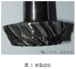 主動錐齒輪輪齒大部分斷裂,未斷裂輪齒根部也已出現宏觀裂紋,觀察斷裂面,可在其中兩處斷齒上發現有明顯貝紋線裂紋擴展痕跡,屬低周疲勞斷裂,圖 1 為主動錐齒輪實物圖。