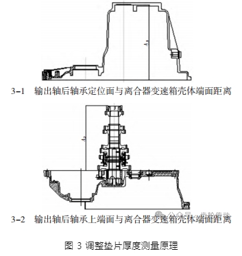 由于裝配過程中圓錐滾子軸承的存在,導致裝配過程中需要為其施加合適的預緊力,而實際裝配過程中預緊力的大小是通過墊片進行調整的,為了能夠選擇合適的墊片厚度,需要測量輸出軸后軸承定位面與離合器變速箱殼體端面距離以及輸出軸后軸承上端面與離合器變速箱殼體端面距離,由于結構復雜直接測量誤差極大,因此需要通過雙測量機分別測量上述參數,最終進行聯合計算。