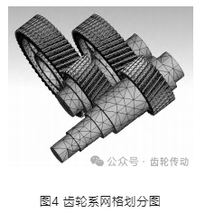 有限元法采用的四面體單元進行網格劃分和計算, 對齒輪傳動系的網格劃分采用的網格大小為5mm,如圖4 所示。在完成了整個網格劃分之后,將各嚙合面的網格按層次細化, 如圖 5 所示。網格劃分完后網格數量為 121131個,節點數量為216074個。