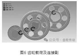 完成網格劃分后對齒輪系添加運動工況在,一級主動齒輪上添加旋轉連接副設置為每秒轉動360o,一級從動齒輪上添加與一級主動齒輪旋轉方向相反的力矩,大小設置為50N·m。二級主動齒輪添加旋轉連接副設置為秒轉動225o,方向與一級從動齒輪力矩方向相同,二級從動齒輪上添加與二級主動齒輪旋轉方向相反的力矩,大小設置為20N·m,如圖6所示。